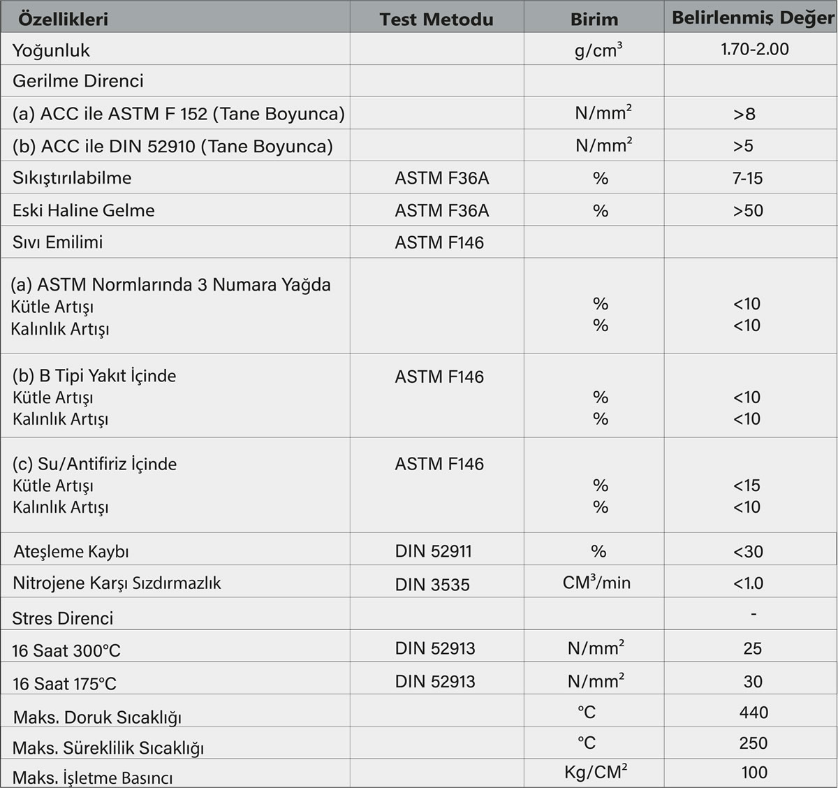 Klingrit Kimyasal Dayanım Tablosu